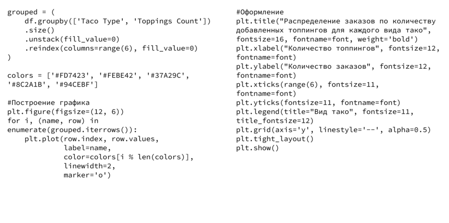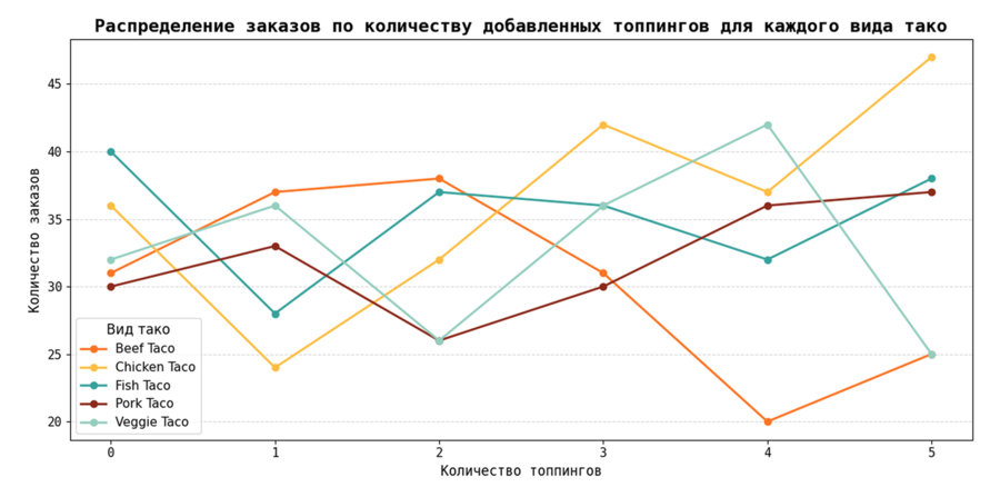 Линейный график. Распределение заказов по количеству добавленных топпингов для каждого вида тако