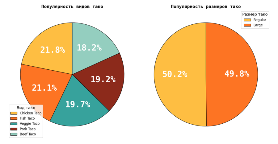 Первым делом я решила проанализировать самые популярные виды и размеры тако. К моему удивлению, все позиции сохраняют примерно одинаковую популярность. Разве что в типах тако чуть вперед вырывается тако с курицей, а обычный размер блюда заказывают на 0,4% чаще.