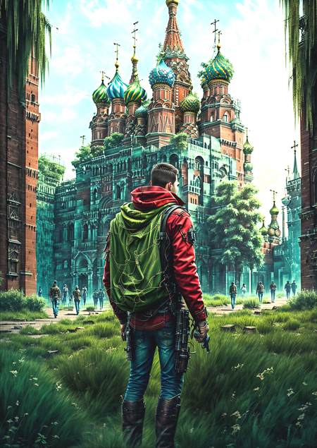 Реалистичный стиль с преобладанием красных, серых и зеленых оттенков, включая милитари расцветку.