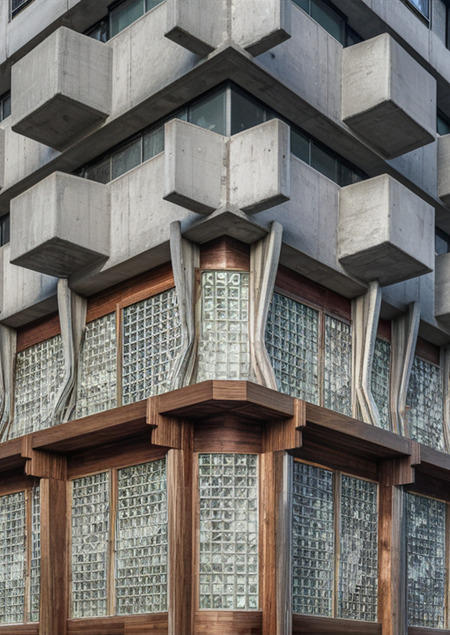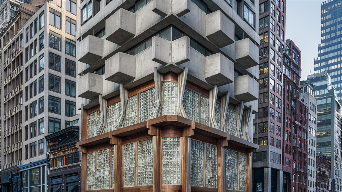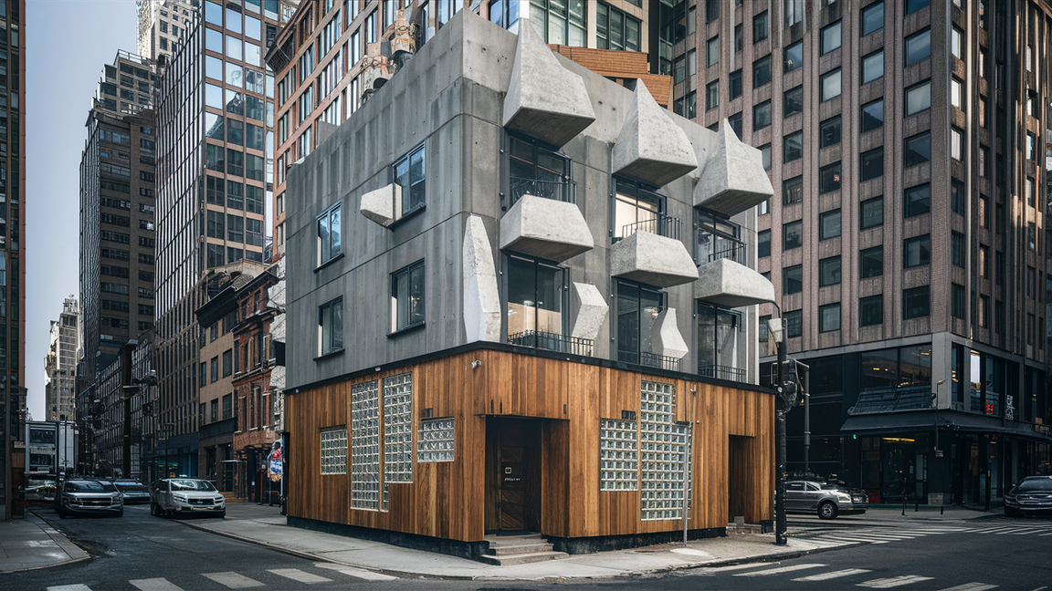 A striking architectural photograph of a unique, four-story building in a bustling American city. The first floor is made of wood, featuring intricate abstract glass block inserts. The top three floors are constructed from gray concrete, with a series of protruding concrete elements in place of windows. The building stands tall amongst other conventional skyscrapers, creating a contrasting and eye-catching scene.