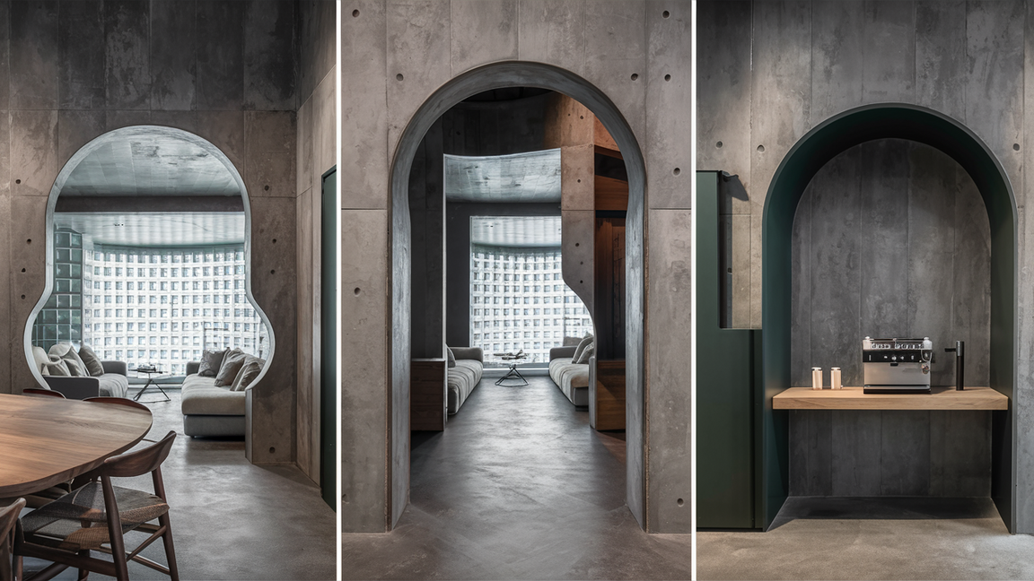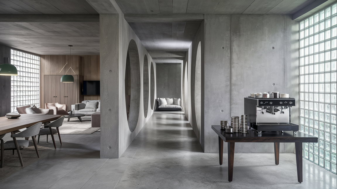 A stunning modern interior design featuring gray concrete and wood walls adorned with abstract round cutouts serving as passageways between rooms. The space is tastefully furnished with a large wooden table and chairs, cozy sofas positioned by glass block windows, and a minimalist coffee station with a sleek coffee machine and coffee cups. The dark green accents provide a contrasting and complementary touch to the overall monochromatic color scheme.