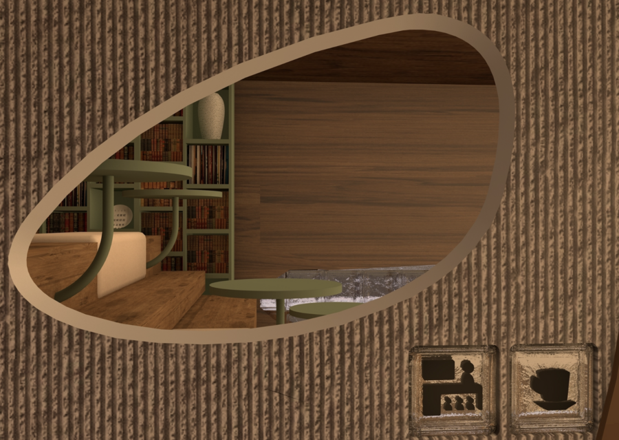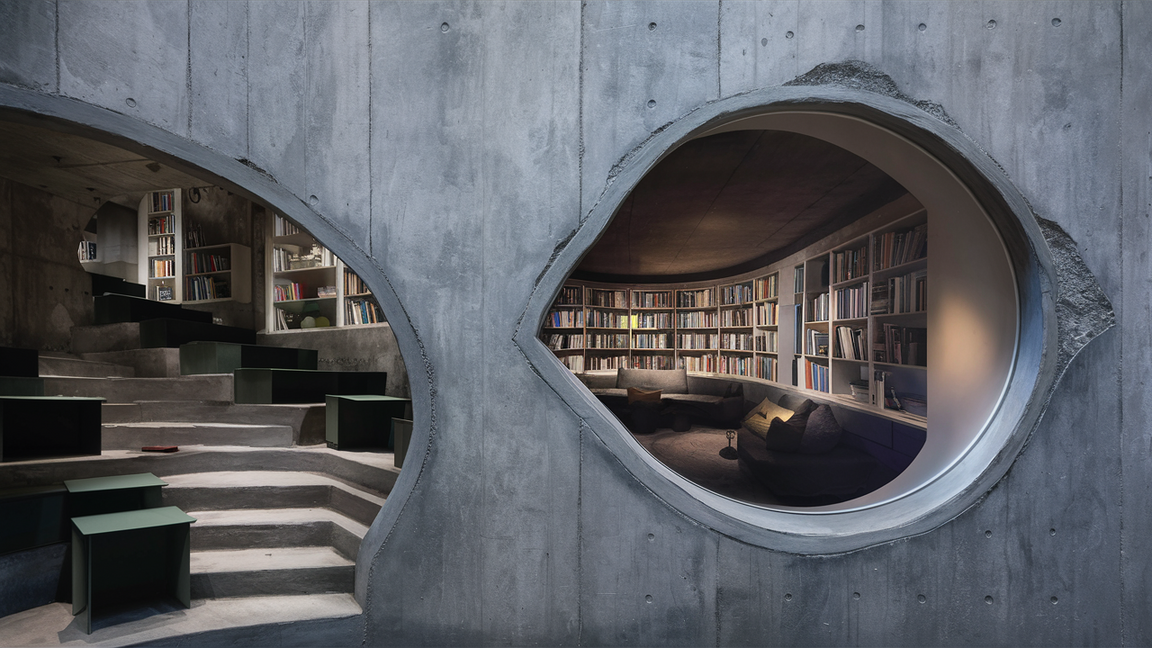 A captivating photograph of the interior of a gray concrete building, revealing an artistic uneven oval window. The window offers a glimpse of a cozy room filled with bookshelves and vases, creating a serene atmosphere. The left side of the image features an innovative design with steps leadin