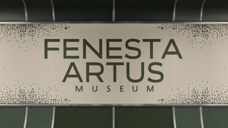 A sleek and modern metro station banner displaying the «FENESTA ARTUS museum» in bold, minimalist typography. The design features a minimalist, beige and dark green color scheme with small, scattered dot patterns, creating a subtle texture. The large letters stand out against the clean background, drawing attention to the museum’s name. The overall look is sophisticated and contemporary, perfectly suited for an American metro station.