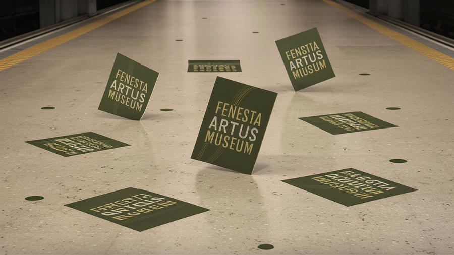 A minimalist-style metro station scene featuring small flyers with a beige and dark green color scheme. The flyers are scattered artistically on the floor, each one showcasing the text «FENESTA ARTUS museum» in bold, large letters. The overall design is clean and elegant, with a few small dots in beige and dark green interspersed in the background, adding a subtle touch of texture. The atmosphere is a blend of urban grit and refined artistry.