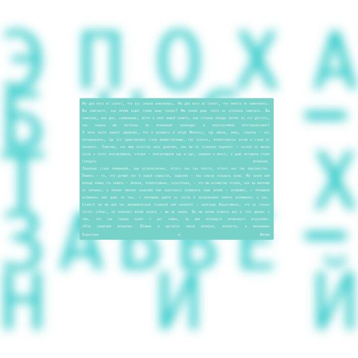 Выставка предполагает тотальность. Все художественные высказывания будут помещены в тотальную инсталляцию и напрямую соотноситься с темой забвения. Вся промо компания будет построена на сиюминутности: анонсы будут размещаться на ледяных пластинах и раскидываться в самых людных местах города, чтобы этот поп-ап анонс был лимитированным предисловием к выставке. Брошюры с хронометражем выставки будут по рекомендации организаторов сжигаться на тонкой металлической пластине, чтобы все исчезло как можно скорее. Документация выставки исключительно только в сторис, чтобы она жила не больше 24 часов. Актуальность существует в упоминаемости.