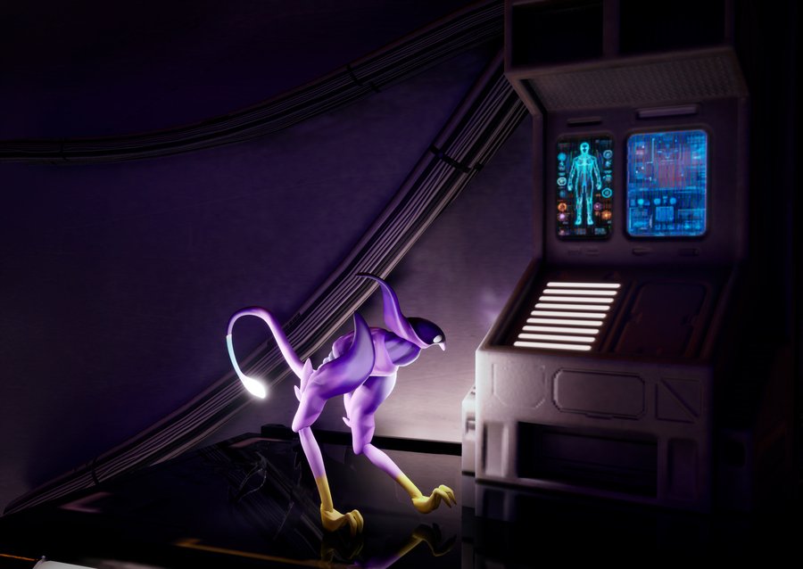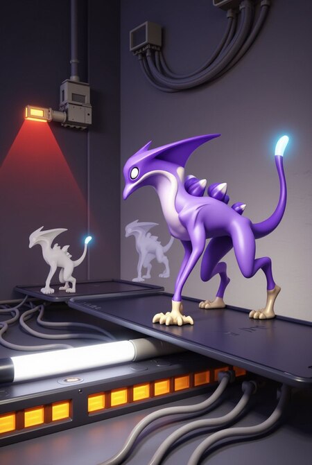 Environment: Sci-fi lab style on a spaceship. Behind the creature, massive cables, control panels with bright indicators and flashing buttons are visible. The floor is made of glossy metal panels that reflect the light of the lamps and the blue glow of the creature’s tail. In the distance, you can see modules with transparent glass cylinders, inside which mysterious objects are stored. The lighting is soft, with muted shades of blue and purple, creating an atmosphere of mystery.