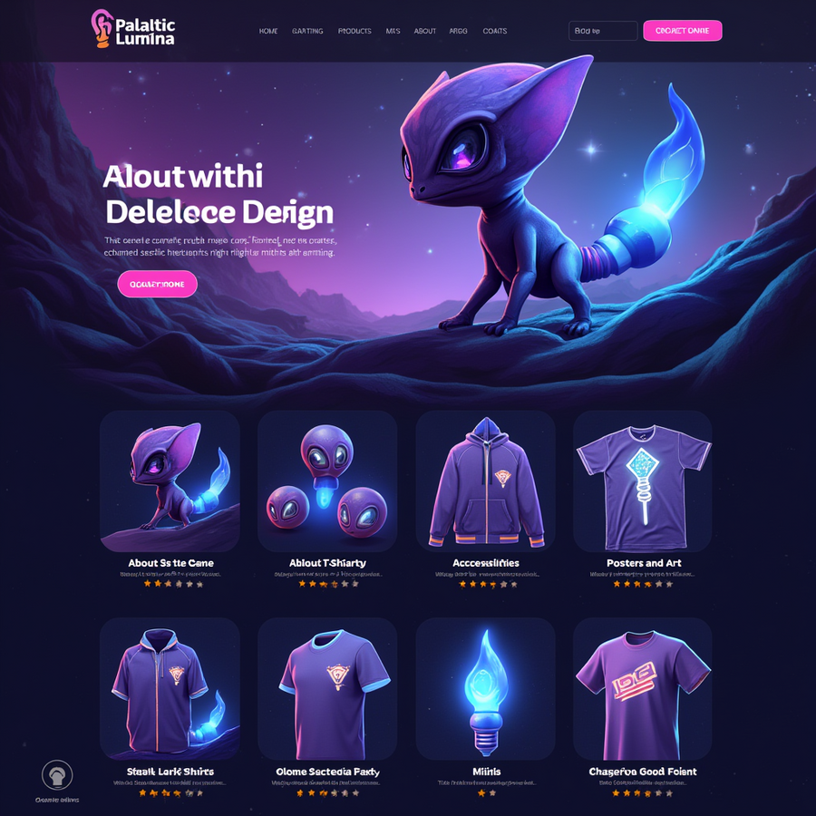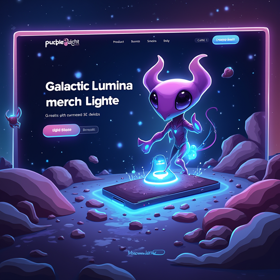 Details: - Store name: «Galactic Lumina» or «Purple Light» - Website design: - Color palette: Shades of purple and blue, reflecting the colors of the main character. — Background: Cosmic landscapes with stars, planets and nebulae. — Interface elements: Neon accents, smooth animations, futuristic fonts. — Home page: A large banner with an image of an alien creature in a dynamic pose, the light of its tail creates a shining effect throughout the page.