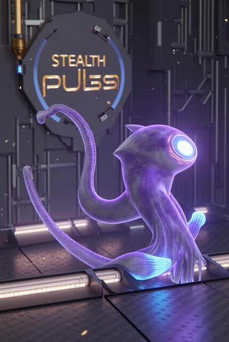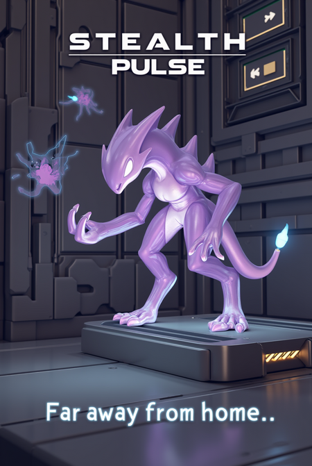 Futuristic logo for the game Stealth PULSE in the style of sci-fi. The main focus is on the combination of dynamics and mystery. The name of the game is made in a modern font with sharp or man-made elements to convey energy and stealth. Add a neon glow effect in shades of purple and blue. Place the slogan Far away from home under the name in a small, elegant font, with a slight glow to create an atmosphere of privacy and suspense. The logo should be minimalistic but memorable, with elements reflecting sci-fi aesthetics.