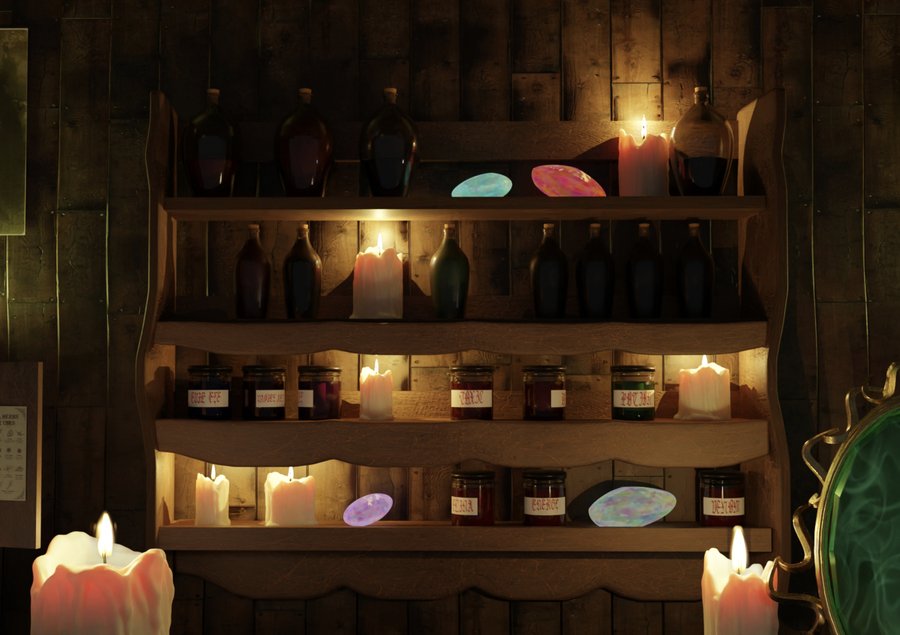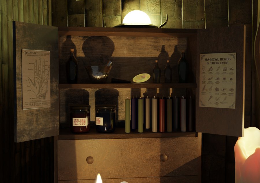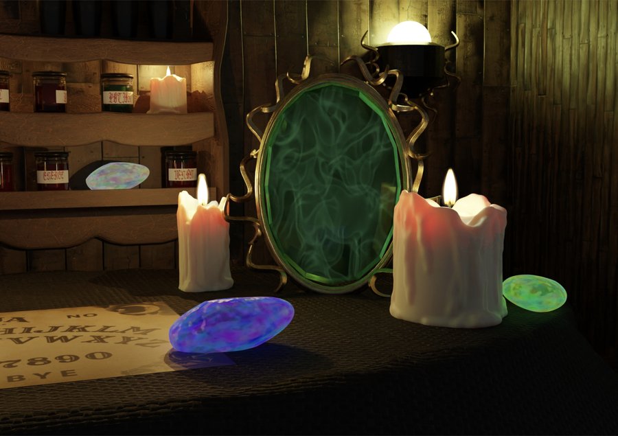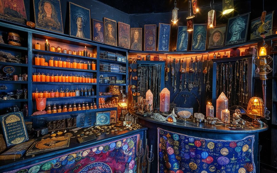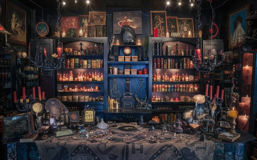 Dark interior of a shop for witches, where there are many different ancient artifacts, candles, amulets and ritual books, Ouija boards are sold.