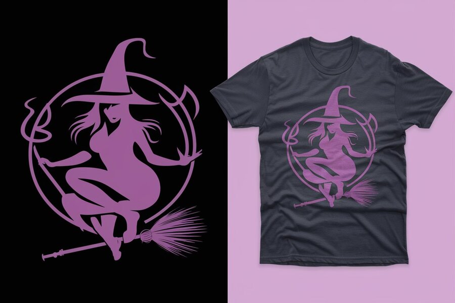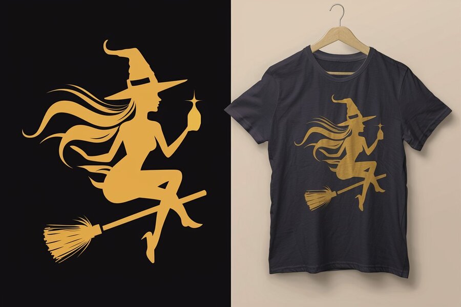 A stylish black T-shirt with a unique witch design, featuring a silhouette of a woman riding a broomstick and wearing a pointy hat. The witch is holding a glowing potion bottle and casting a spell. The overall design is bold and eye-catching, perfect for those who appreciate a touch of whimsy and magic in their fashion.