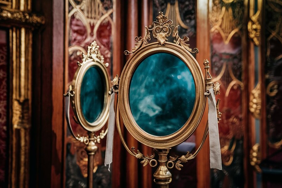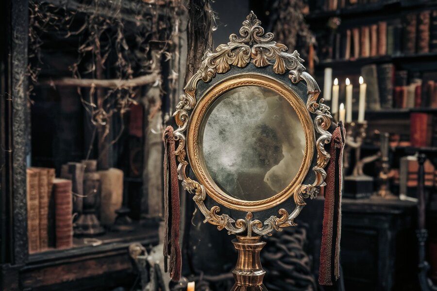 A captivating photo of an antique magic mirror, adorned with intricate gold and silver patterns. The mirror is set within an ornate wooden frame, with a mysterious and slightly cloudy reflection. The background reveals a dimly lit room, filled with dusty books, candles, and hidden artifacts, creating an enigmatic and historic atmosphere.