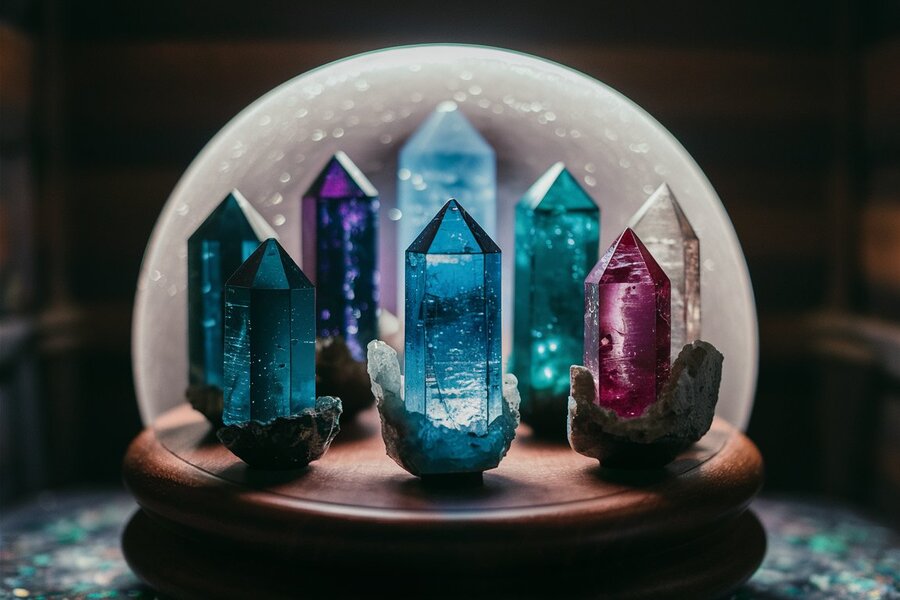 A stunning photograph capturing various shades of blue and green magic crystals. The crystals are arranged in a semi-circle on a dark surface, with a soft light casting a glow on them. They emit a mysterious and enchanting aura, transporting the viewer into a world of magic and wonder. The overall atmosphere of the photo is ethereal and mystical, with a touch of whimsy.
