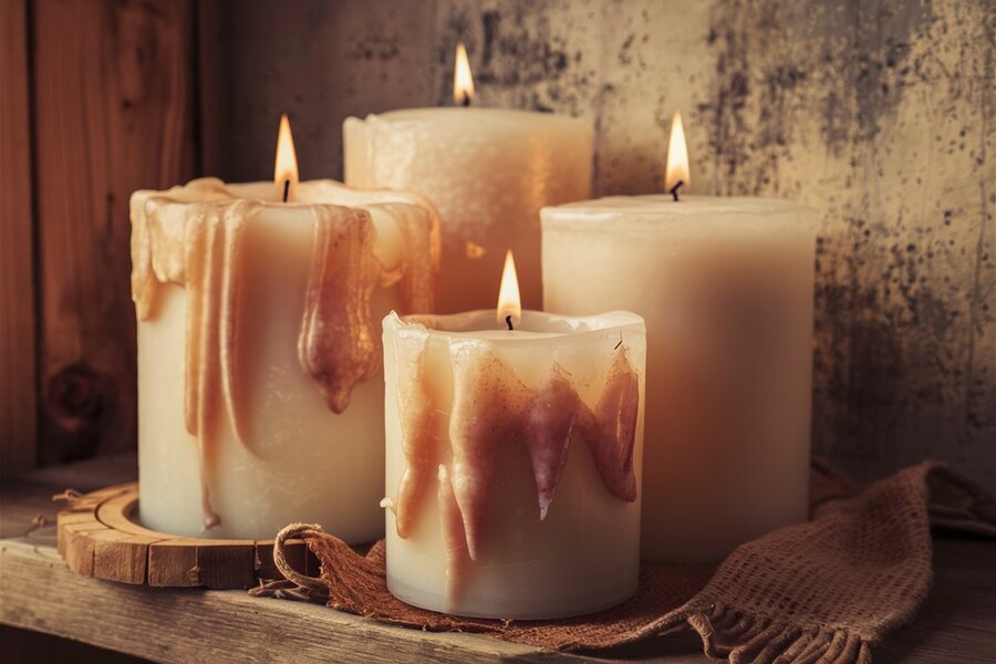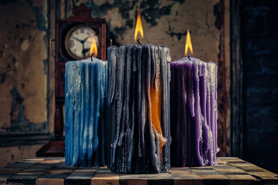 A striking photograph of three large candles, each with distinct wax stains that showcase the passage of time. The candles are made of different colors: blue, black, and purple. They are standing on a wooden surface with a checkered pattern, and their burning flames cast an eerie glow across the scene. In the background, there is an old, rustic wall with peeling paint and a worn-out clock. The overall ambiance of the photo is mysterious and slightly ominous.
