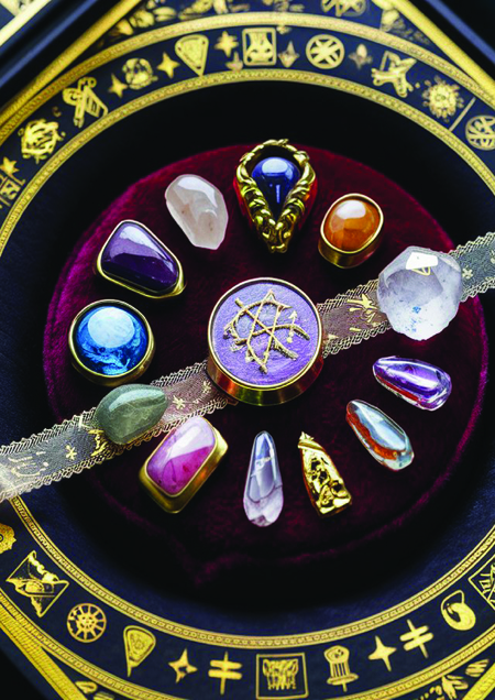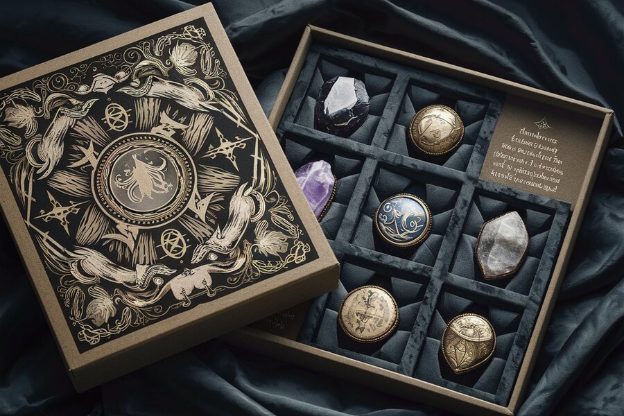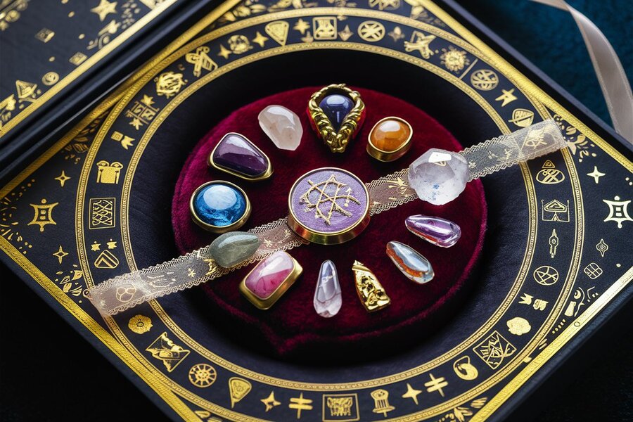 A captivating image of a beautifully designed box, adorned with intricate engravings and ornate golden accents. The box is filled with an array of colorful crystals, each with its own unique magical properties. Surrounding the crystals, there are various talismans, amulets, and charms suspended in mid-air, giving off an ethereal glow. The overall atmosphere of the image exudes a sense of mystery, wonder, and ancient magic.