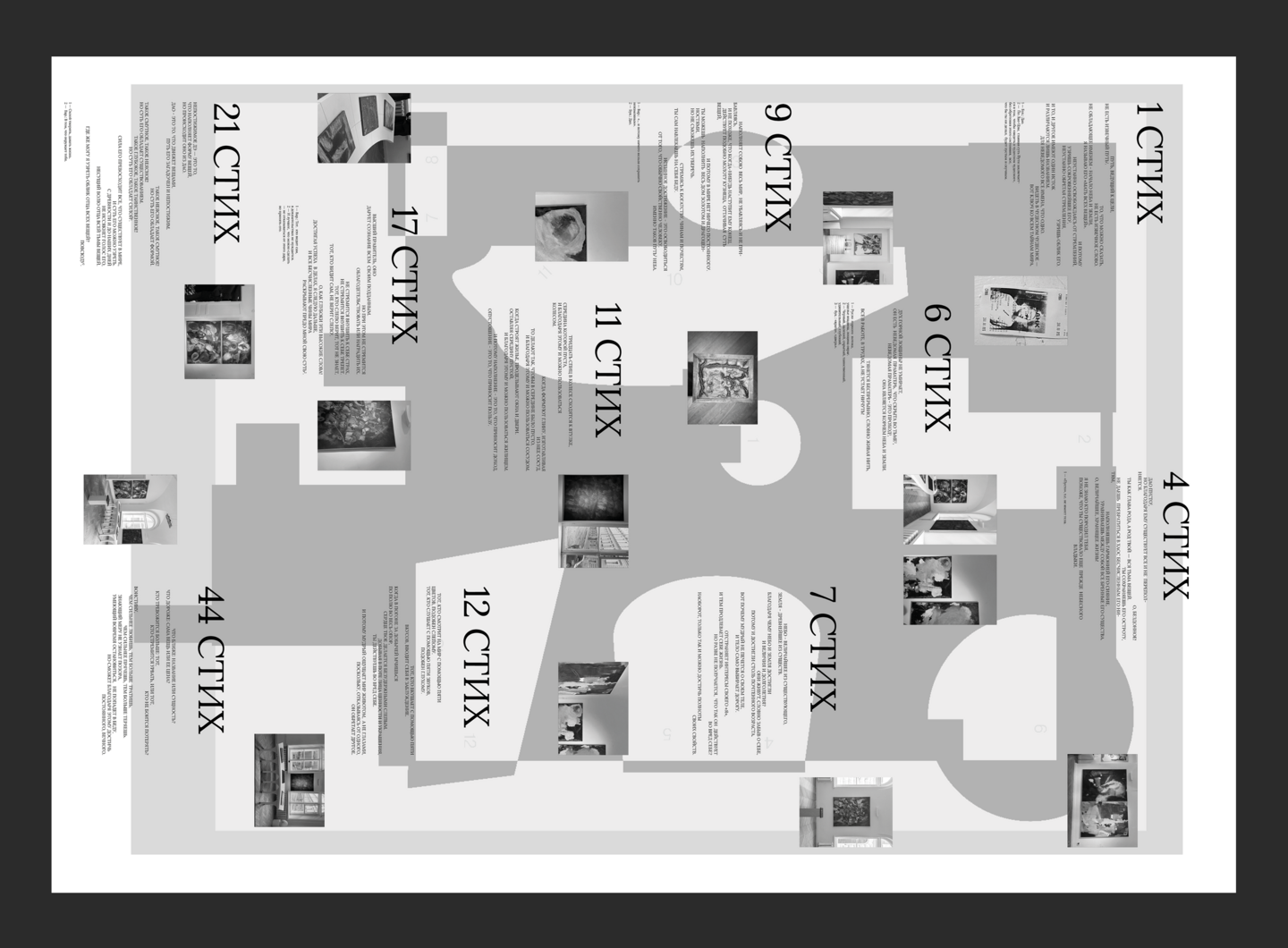 Оборотная сторона также собирает плакат, который демонстрирует архив прошедшей выставки и состоит из воссозданного по памяти плана пространства и фотографий прошедшего события.