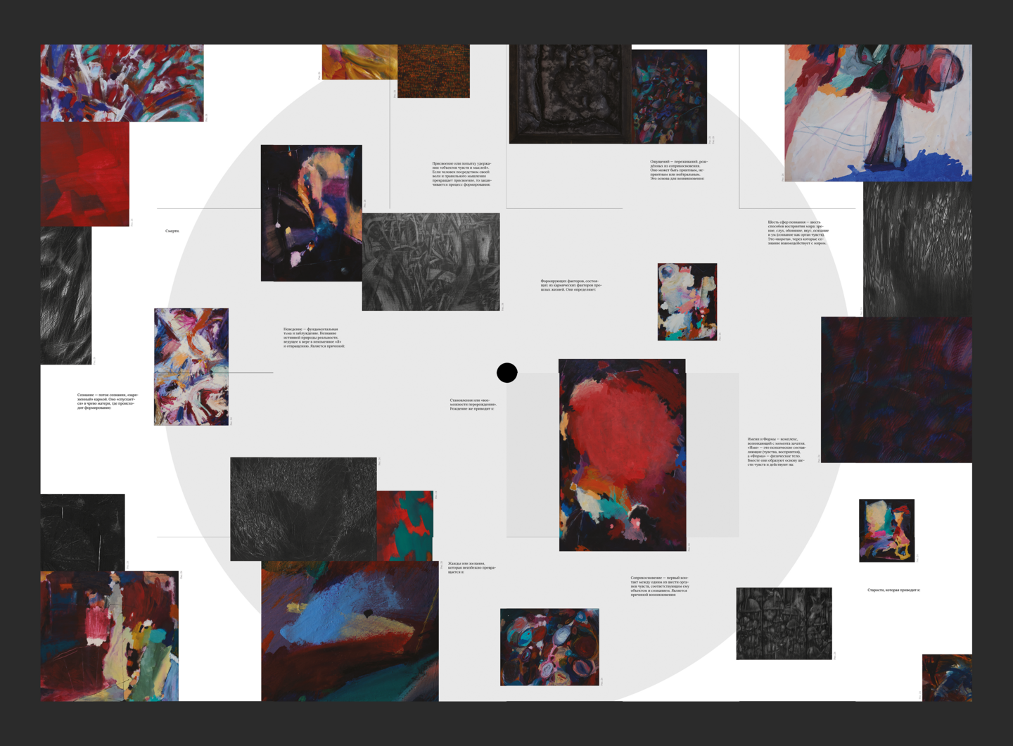 Развороты, собранные в правильном порядке, образуют плакат А1, который соединяет части картин в единый момент времени — срез сознания.