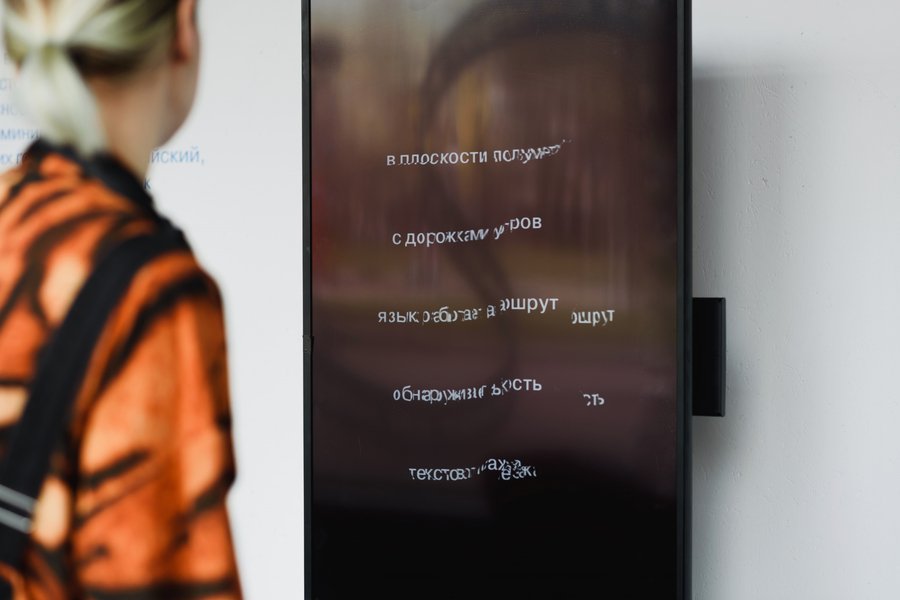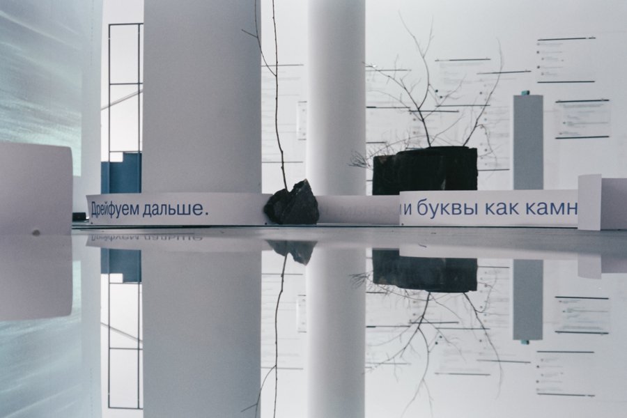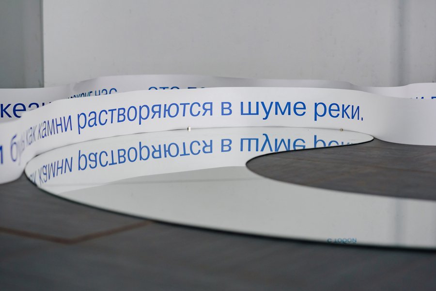 В пути зрителя сопровождает поэтический текст, который задает направление маршруту и участвует в формировании языкового ландшафта. Плавно огибая зеркальные реки, он вплетается в архитектуру выставки бумажными лентами-строками.