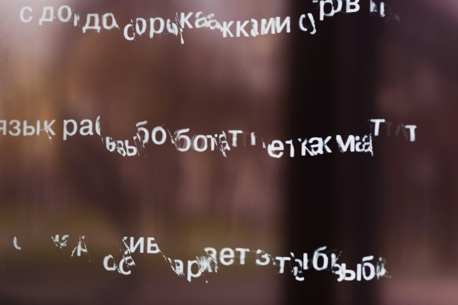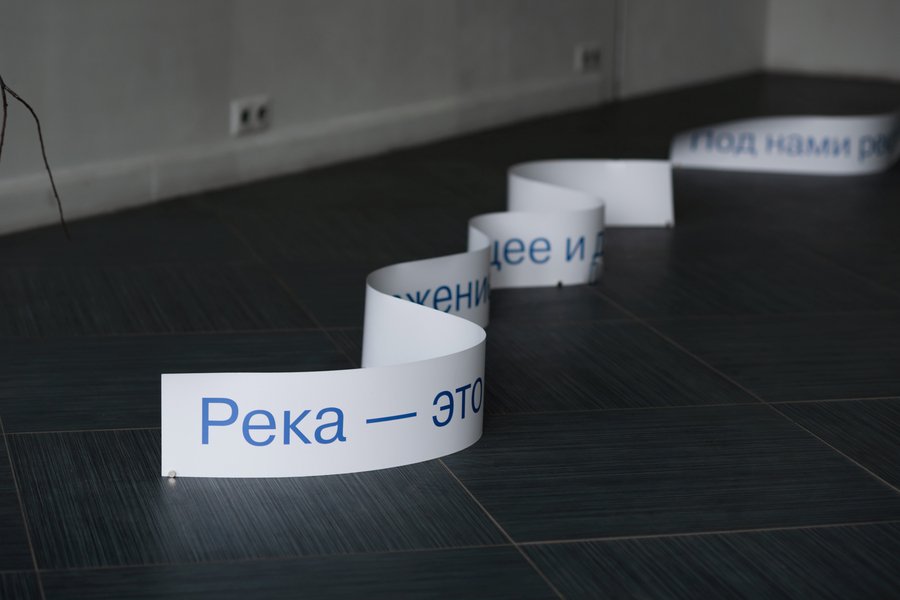 Проникая на улицу, текст отображается на окне. Его образ — одновременно и лента реки, повторяющая изгибы рельефа, и бегущая вдаль строка с названием выставки, которое отражается и преломляется в изгибах ленты.