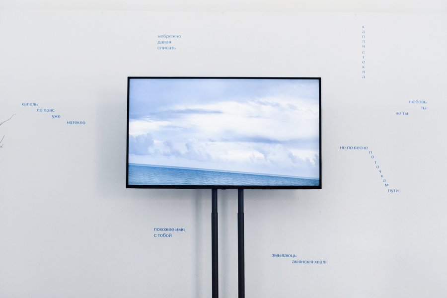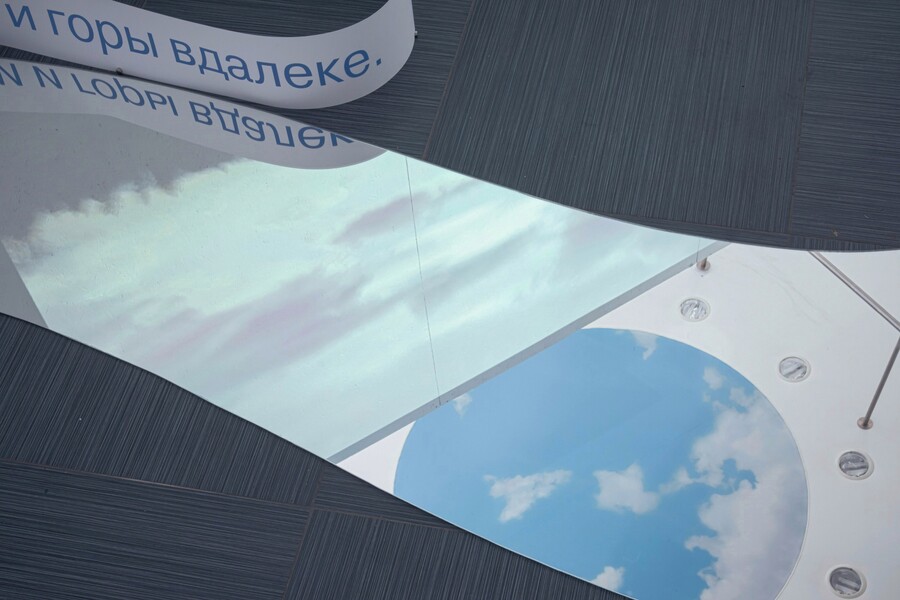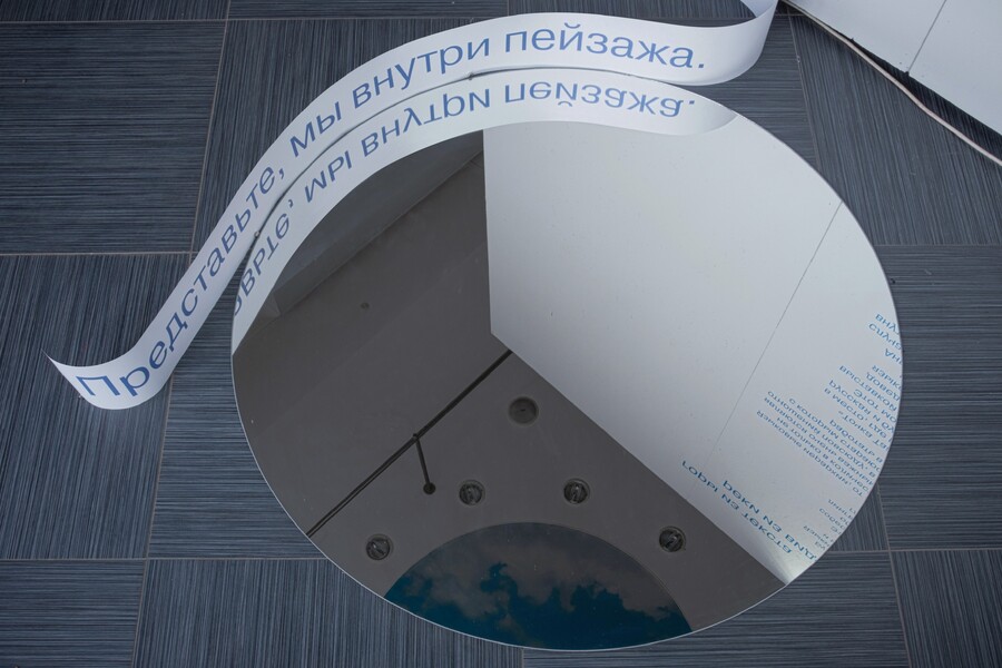 Подобно тому, как река придает облик окружающему ландшафту, архитектуру выставки формируют зеркальные заводи. Поверхность воды с небесными отражениями — еще одно измерение, связывающее выставочное пространство и преломляющее в себе фрагменты текста и видео.