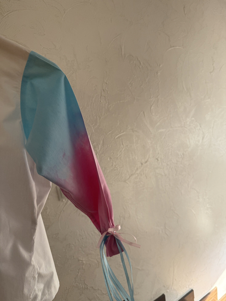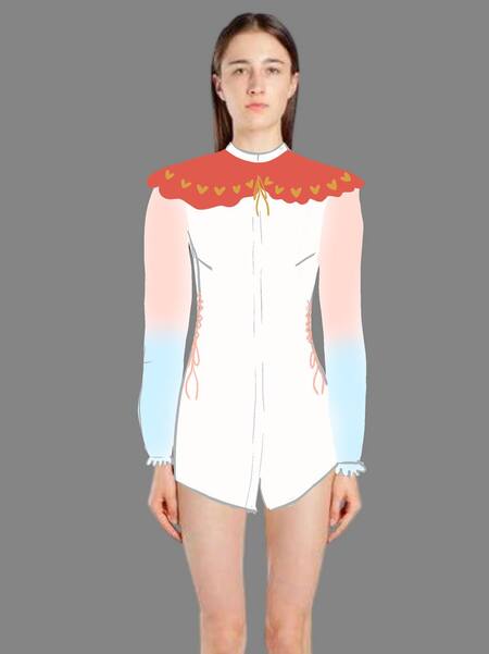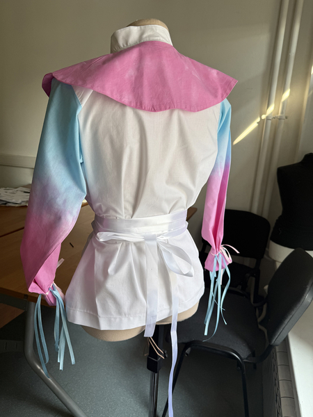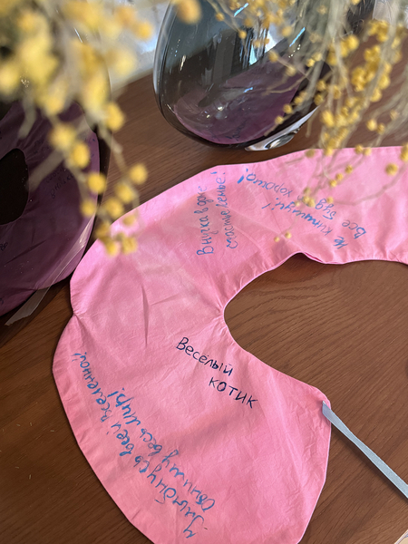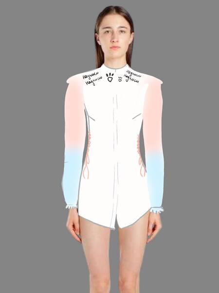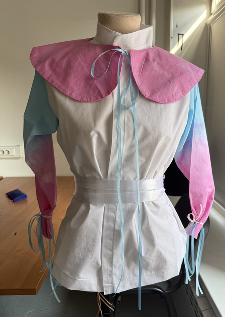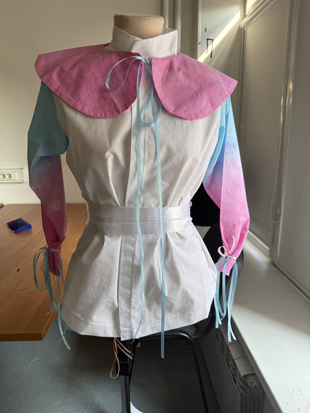 Рубашка символизирует пробуждение весны. В ее основе — белый хлопок, передающий ощущение чистоты и обновления. Рукава, выполненные в градиентном переходе, отражают нежность и наивность первых весенних дней. Внутренняя сторона воротника украшена надписями с фразами родных и близких — они представляют личные ассоциации автора, создавая особую связь между одеждой и ее смыслом.