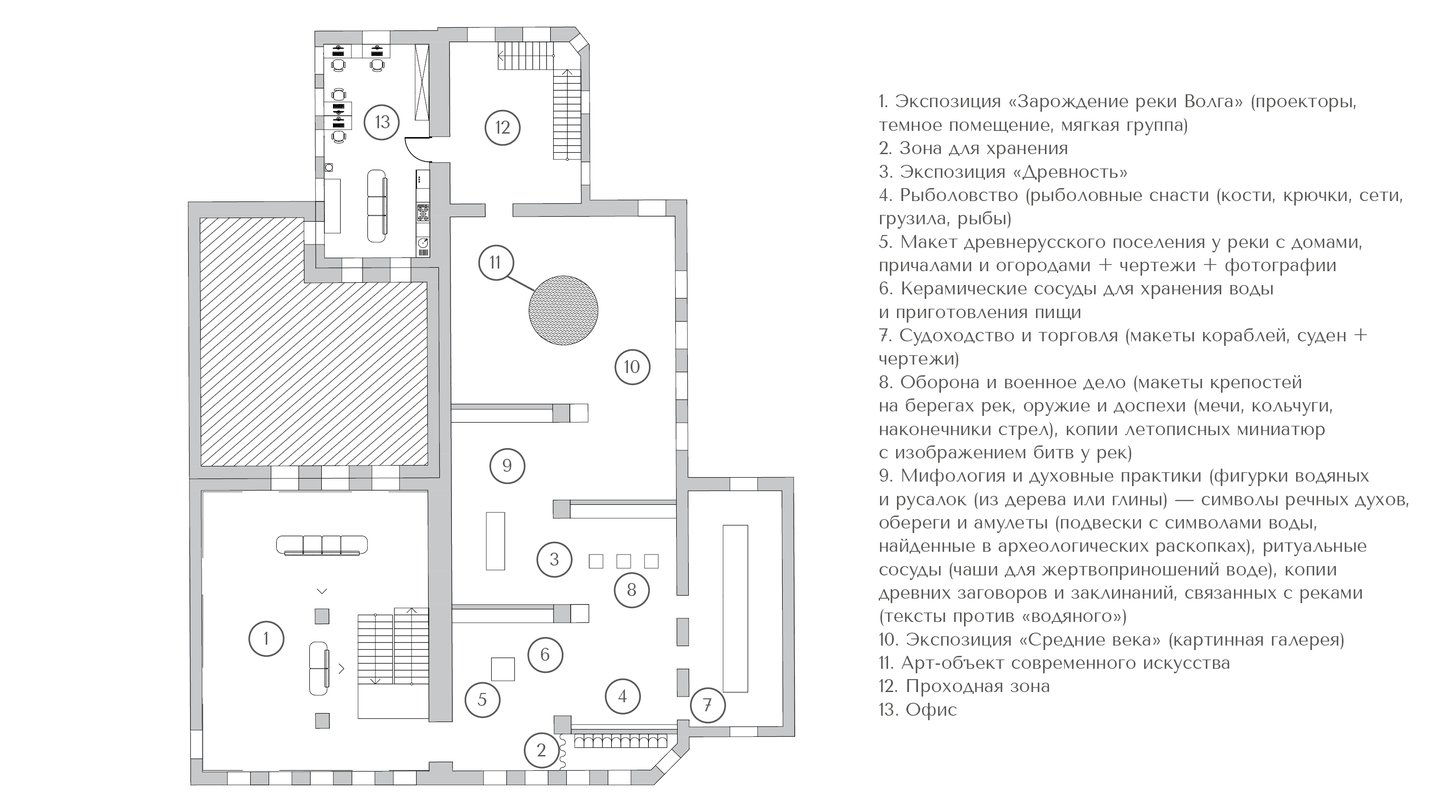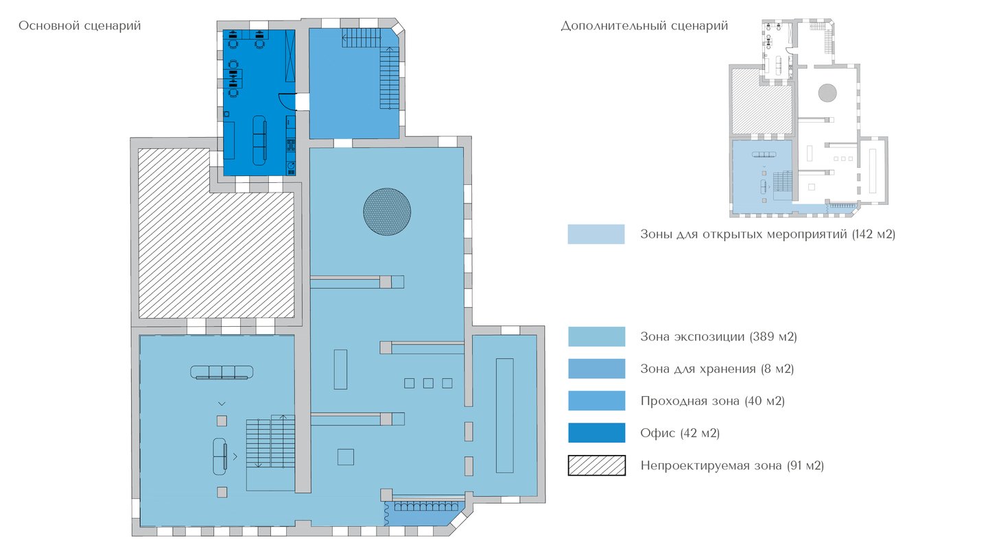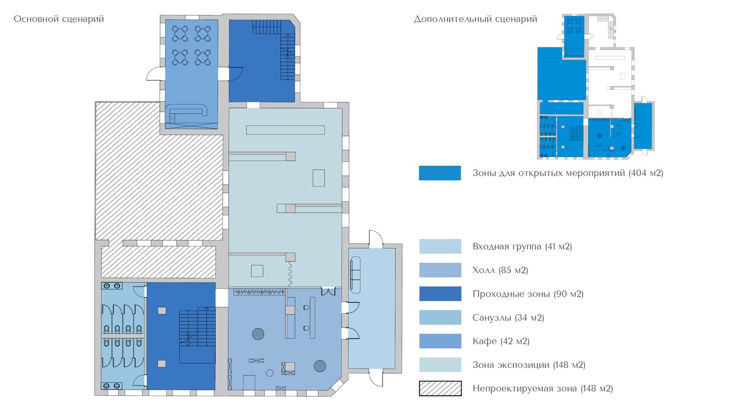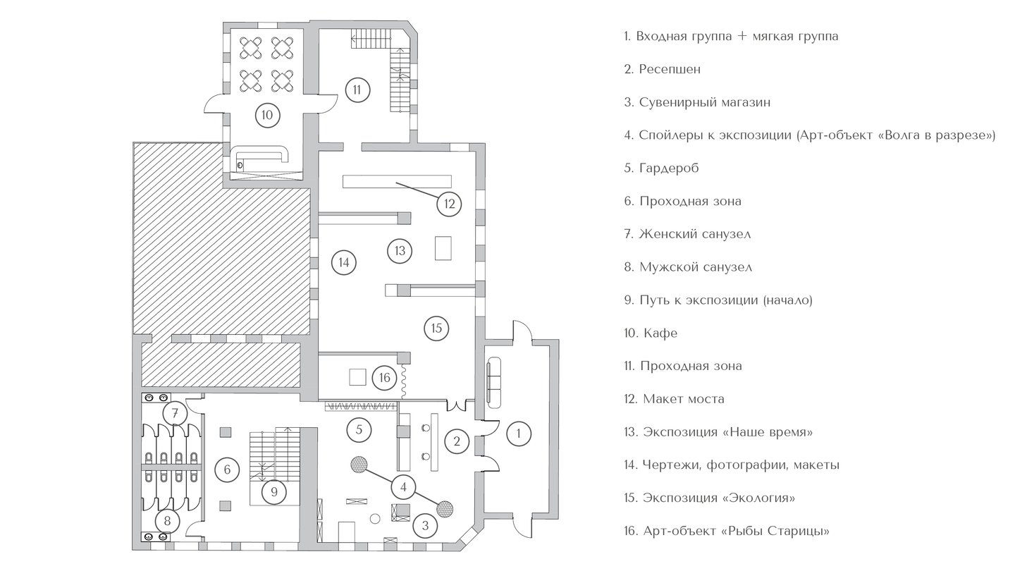 1. Исторический блок — архивные материалы, карты, чертежи, проекции, макеты и картины. 2. Арт-зона — выставки, инсталляции, картины и книги. 3. Общественные зоны — кафе, магазин, открытые веранды, летние площадки.