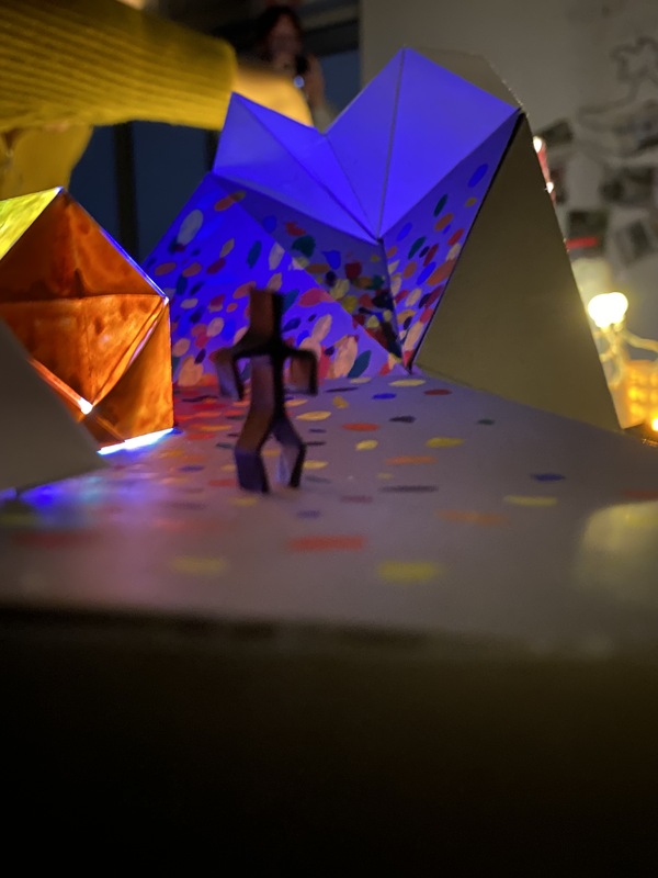 Сам отшельник создан из черной бумаги, поскольку полон темных мыслей и пессимизма, множество складок — постоянные тревожные мысли.