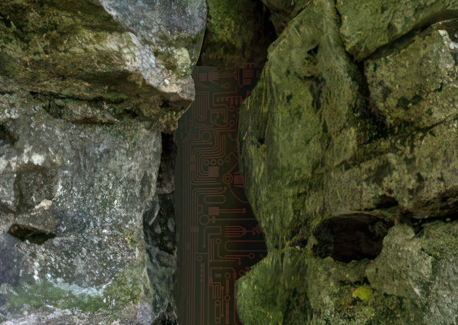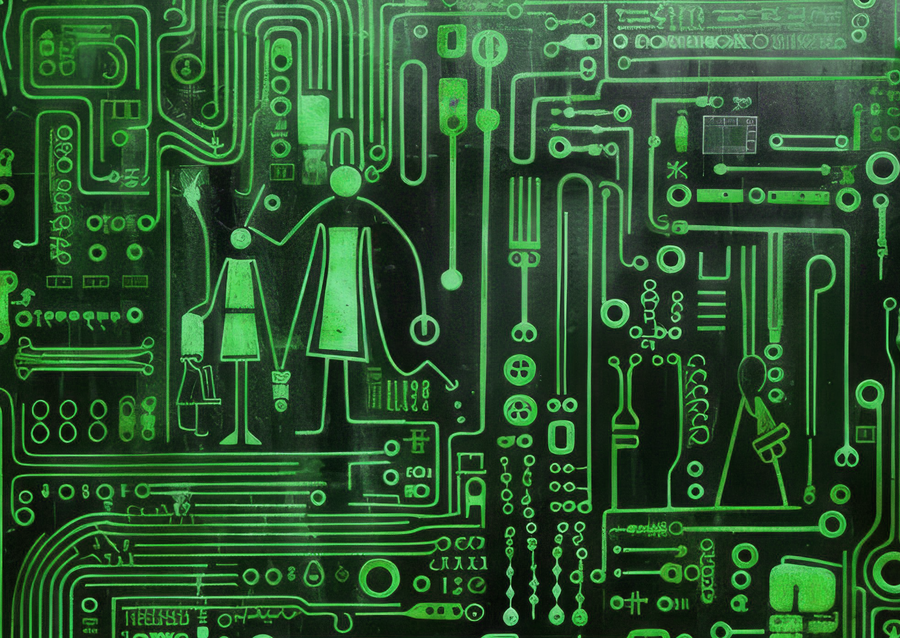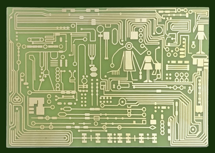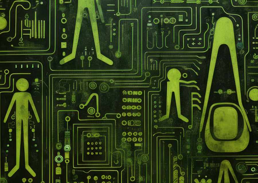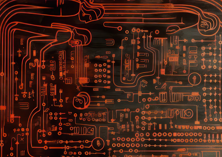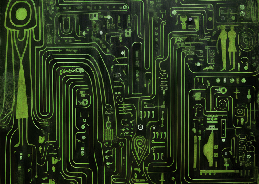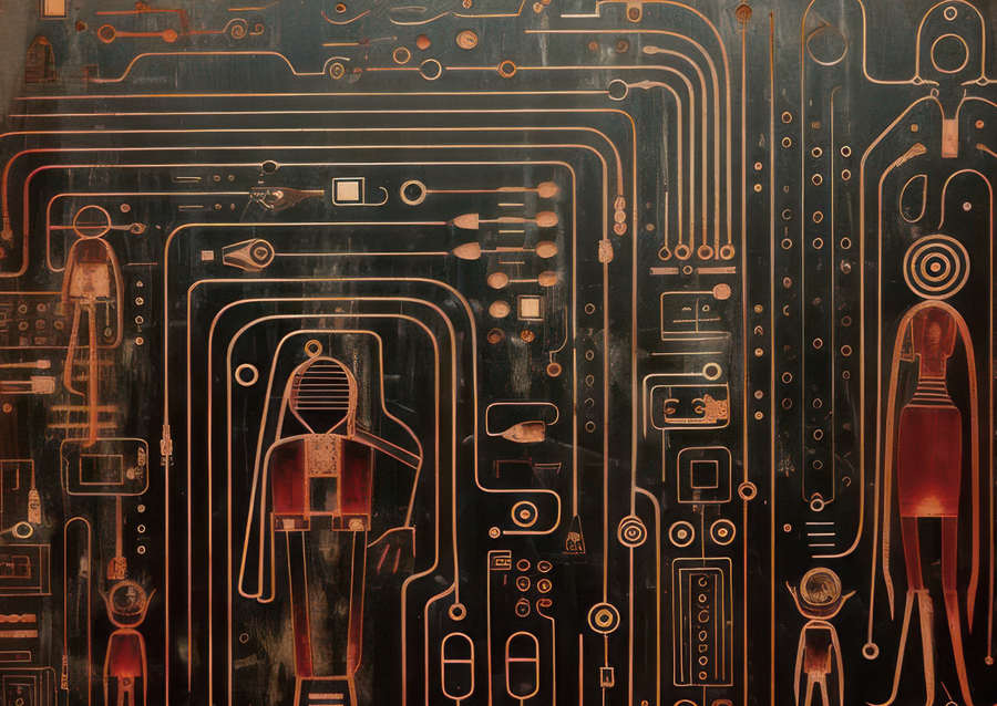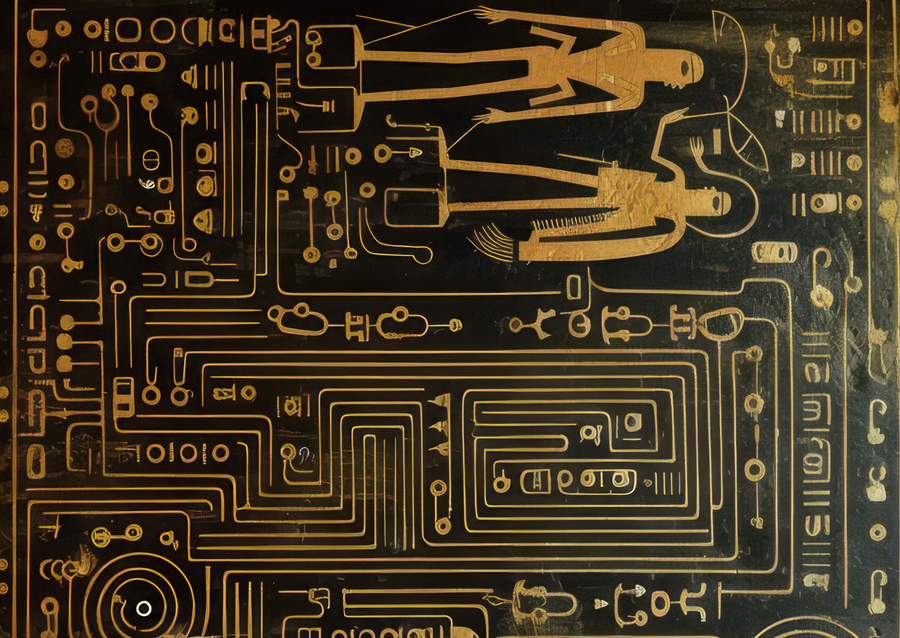 AI: Midjourney. Prompt: petroglyphs, cave paintings of people lifistyle on printed circuit board
