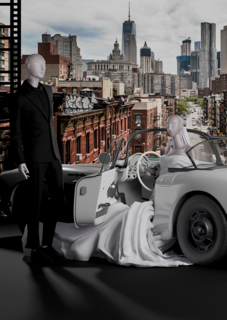 Главная ассоциация свадьбы — белый кабриолет, поэтому моя концепция заключается в том, что в серии витрин будет присутствовать машина и взаимодействие жениха и невесты с ней.