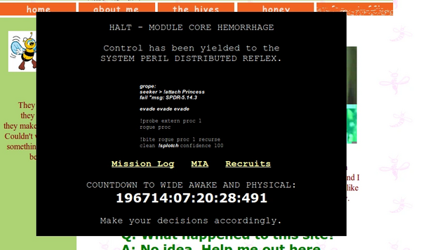 На первой странице был счетчик, отсчитывающий время до 27 июля 2004 года (когда «сетевое дросселирование [будет] ослаблено»), 10 августа 2004 года (когда «эта среда [будет] метастазировать») и 24 августа 2004 года (в 8:06 утра, когда она будет «бодрствующей и физической») К концу игры был счетчик, отсчитывающий время до дня, когда «Ковенант» нападет на Землю. Сайт исчез из Интернета в 2015 году.