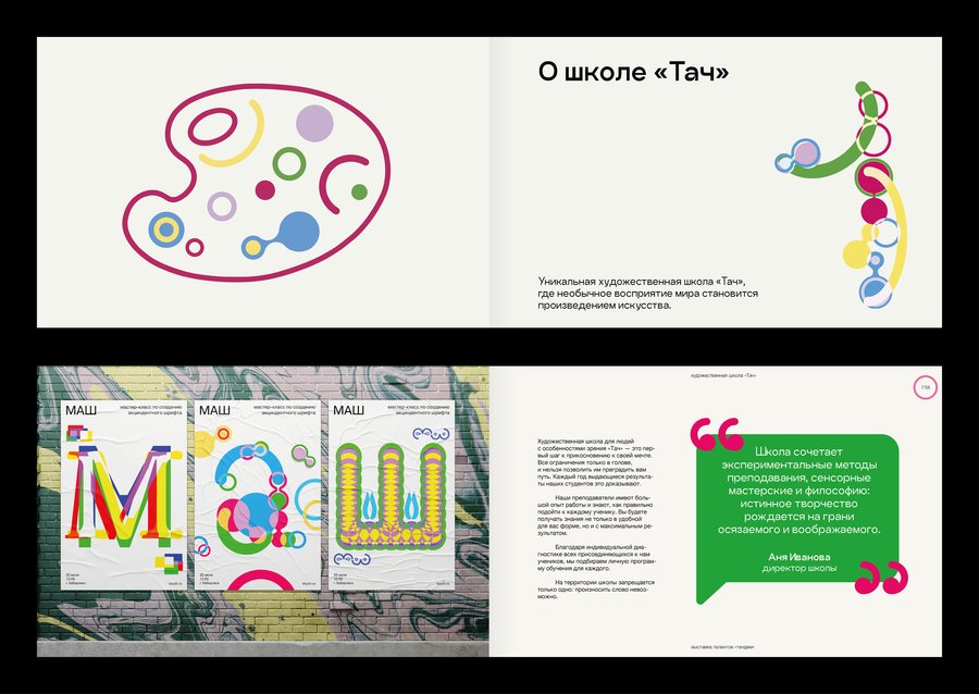 Проект, объединяющий выставочный зал «Тачдем» с уникальными работами талантливых учеников художественной школы «Тач» и книгу, которая дополняет выставку, раскрывая творческий процесс и идеи авторов. Реализация книги также помогает углубиться в концепцию пространства.