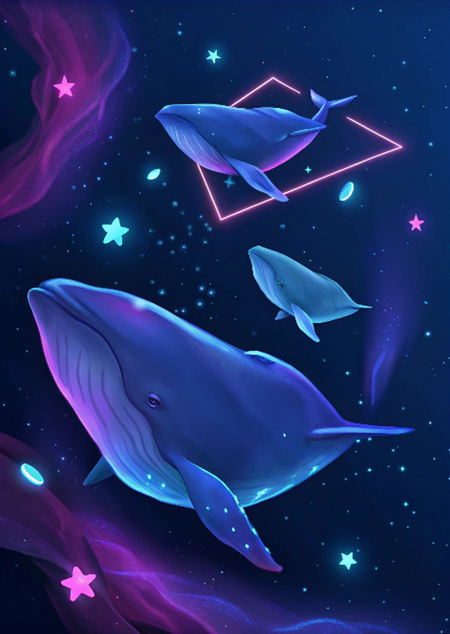 Промпт: Whales swim in space. The background is cosmic, dark with purple and blue gaps. There are stars around the whales.