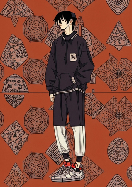 Для создания использовалась нейросеть https://exactly.ai/ Запрос: «Make japanese modern young streetwear fashion pattern»