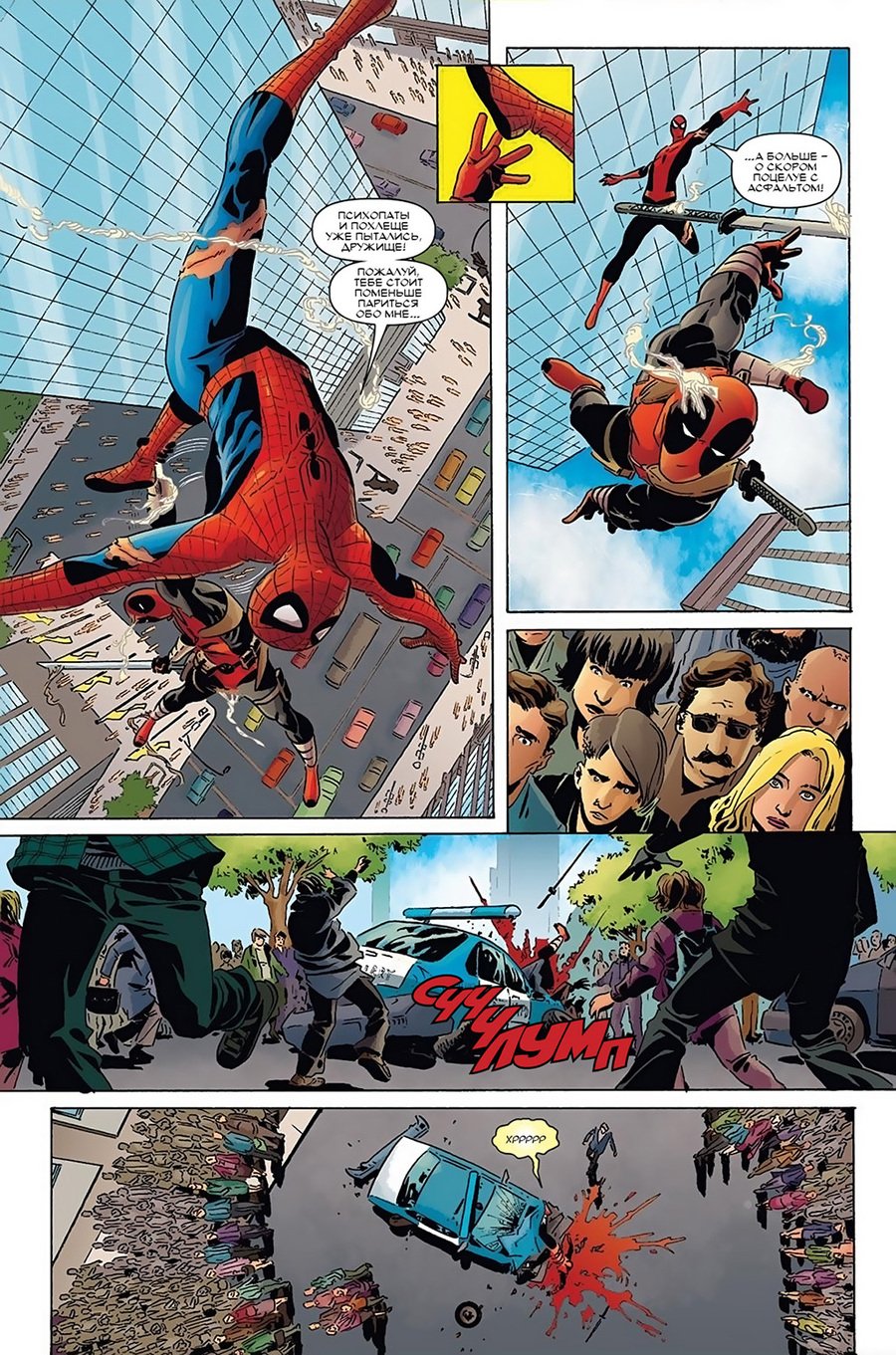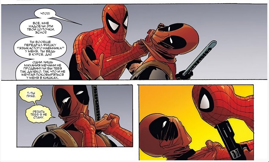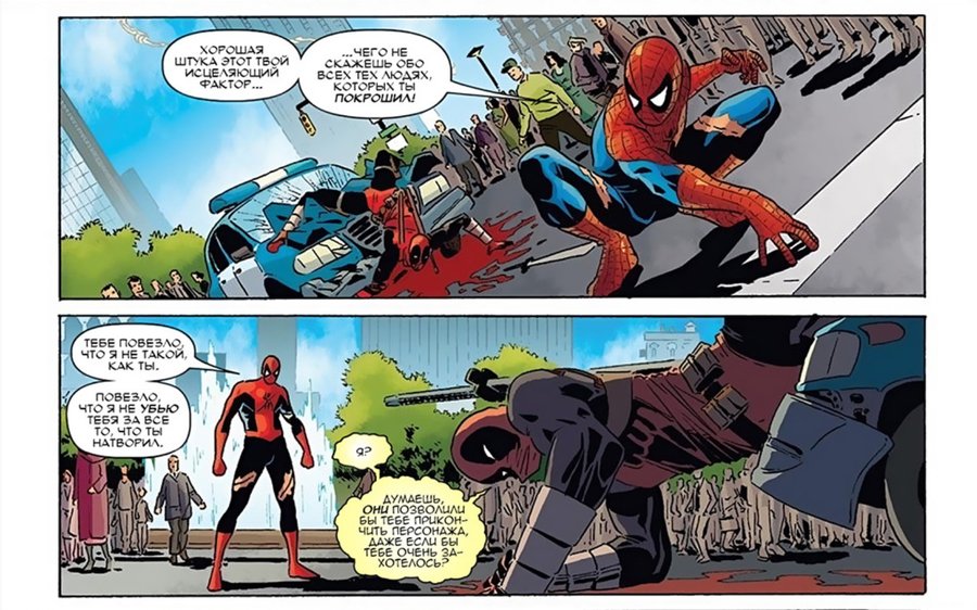 Уже здесь, в драке с пауком, можно заметить, как наличие мета сознания в совокупности с практической бессмертностью и незаурядным интеллектом приносят свои плоды: если не сейчас, то несколько позже отчётливо видно, как Дэдпул борется с вопросами идентичности и смысла своего существования, стараясь через разрушение всего супергеройского мира разрушить эти рамки между мирами, перестать «быть чьей-то марионеткой».