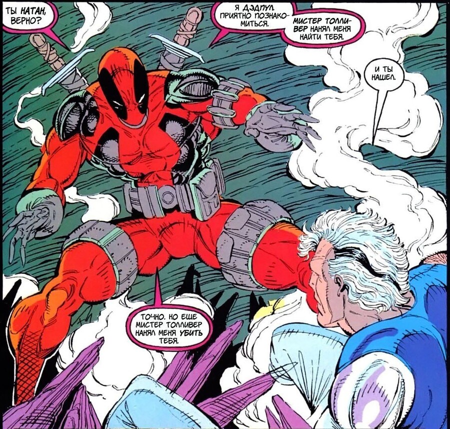 В первом своём появлении в серии комиксов «The New Mutants», № 98 (1983) Дэдпул здоровается со своим «заказом» и сразу демонстрирует свои две главные особенности: он наёмник и он не клишированный наёмник. Наоборот — его появление сопровождается кучей острот и большим количеством бабблов, что выдает в нём бесконечного болтуна и шутника. Даже его последующий проигрыш совершенно никак не сказался на отношении к нему фанатов из-за харизматичного дебюта.