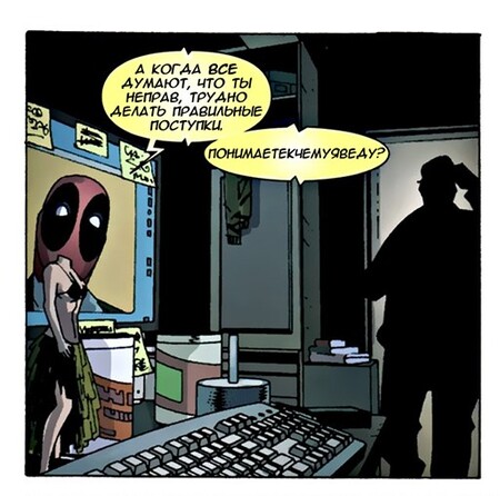 Внутренний голос также демонстрирует борьбу между добром и злом внутри Дэдпула. Он осознает последствия своих действий, но намеренно выбирает путь насилия как способ разрешения своих проблем. Это создает интересный парадокс: вероятно, Дэдпул хочет бы быть героем, но его методы и внутренние демоны ведут его к противоположному.
