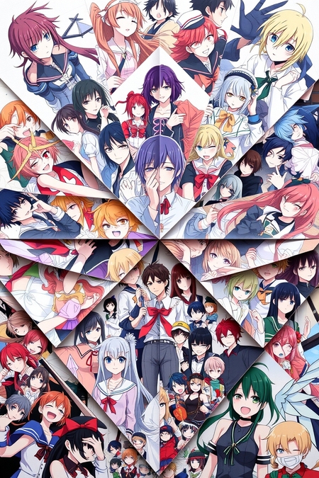 Запрос: An intricate origami style collage of popular anime, viewed from an overhead bird’s eye perspective, featuring a folded paper look and geometric precision.