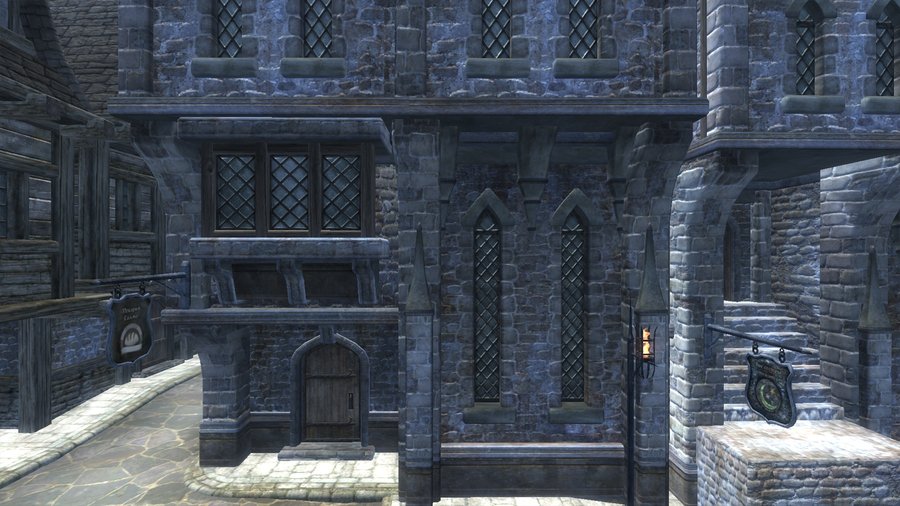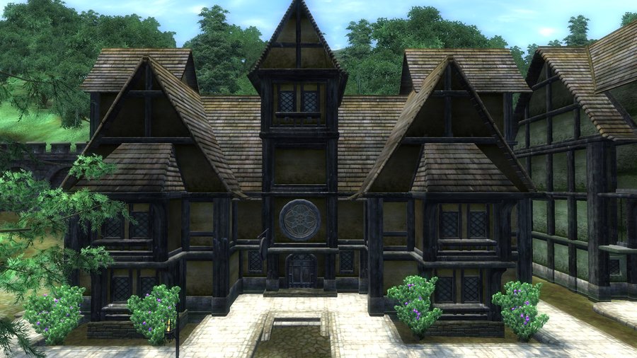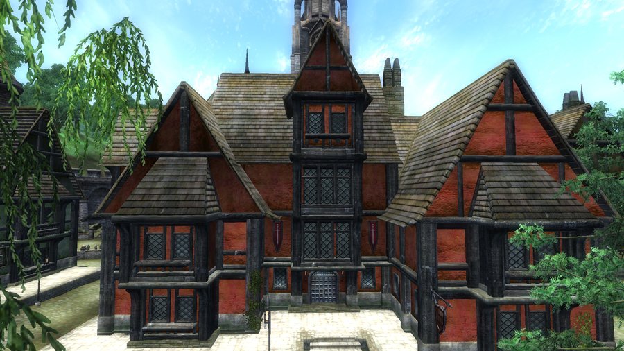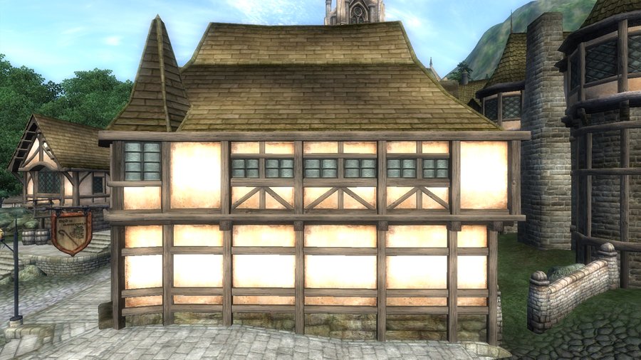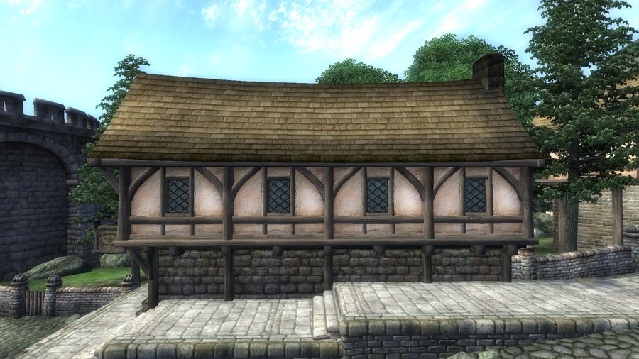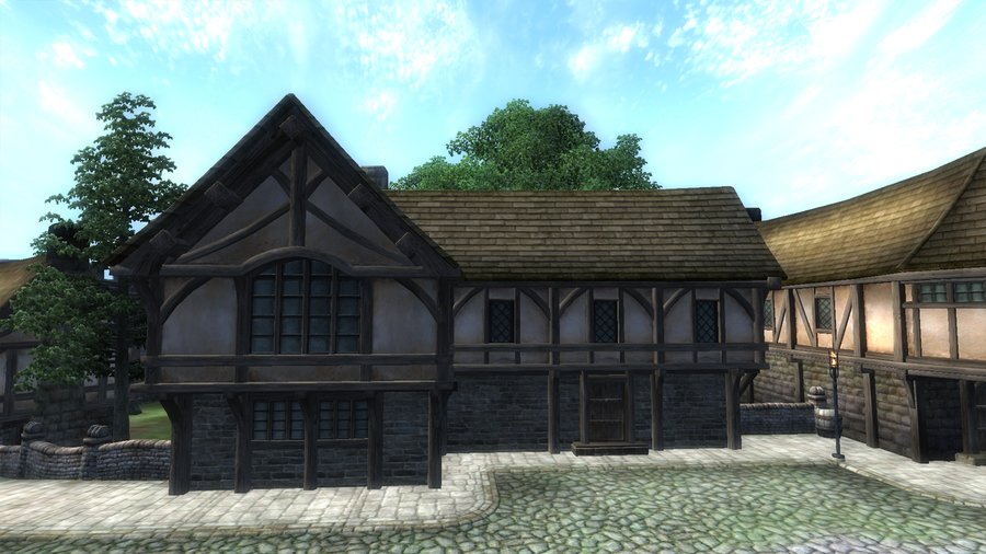 Фахверк — это здания, у которых несущая конструкция состоит из деревянных балок. А пустые пространства заполняются разным материалом. Такие здания часто встречались в Европе в Средние века¹. Здания с похожим стилем встречаются в городах Сиродила. Например, в Лейавине. Это город, расположенный на юге в болотистой местности с частыми дождями. Конструкция похожа на фахверк, но отличительной чертой являются яркая краска у домов зажиточных граждан, общественных мест и гильдий. Такое обилие цвета может быть связано с тем, что в городе проживает много зверолюдей и раньше эти территории принадлежали не Сиродилу. Крыши у домов таких зданий ровная и вытянутая. Внизу окон расположены оконные отливы, которые нужны при частых дождях.