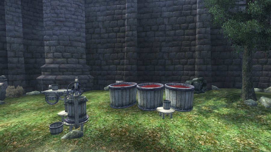 Обратим внимание на детали. Можно заметить, что в городе очень много красных элементов. Это и флаг города, и листва на деревьях, и ягоды для вина на задних дворах домов, и цветы. Скинград выглядит загадочным, намекая на тайну графа, который уже много лет правит в городе.