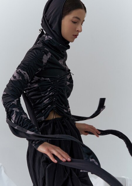 Коллекция состоит из широкого ассортимента предметов одежды — от пальто и брюк до платьев и топов, все они вписываются в общую концепцию, отражая идею сокрытия, заботы и изоляции.