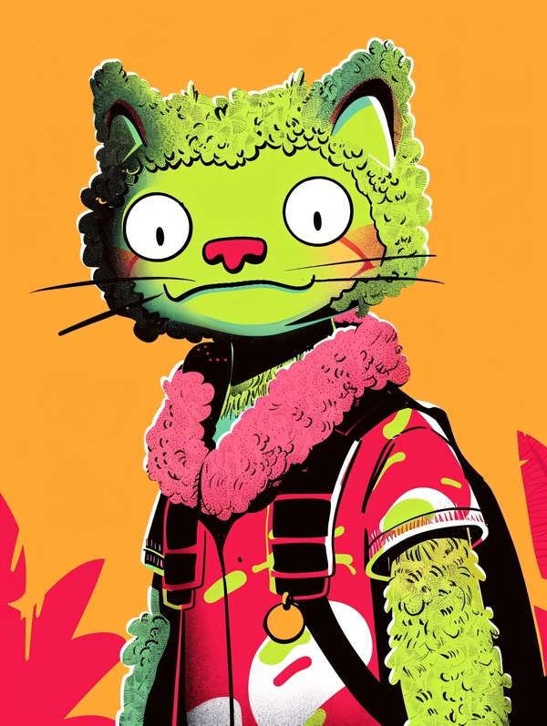 Промт обложки: illustration of cat anthropomorphic green fluffy character wearing red Hawaiian shirt forest and plants on the background --cref https://s.mj.run/ZDKDMIngliQ --ar 3:4 --sref https://s.mj.run/oSoUvUfbJQs --chaos 10