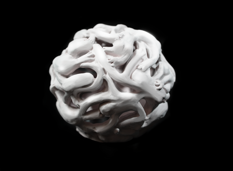 Promt: 3D-rendered ceramic sculpture in the shape of a heart with a smooth, glossy white surface. The sculpture has intricate cutout patterns of hearts and organic, teardrop shapes scattered across its surface. Soft, warm light glows from within the sculpture. The background is a dark gray gradient to enhance the glowing effect.