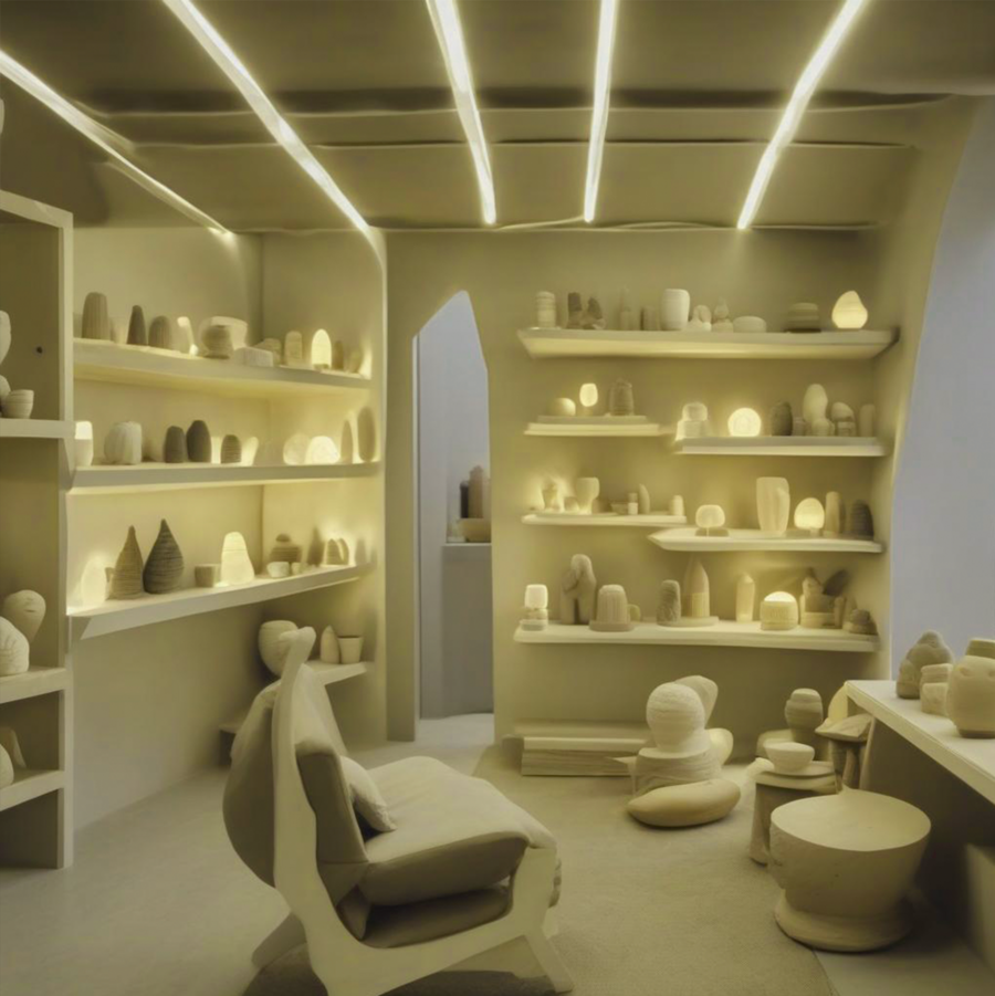 Promt: Modern detailed ceramic lamp shop with minimalistic design and warm lighting