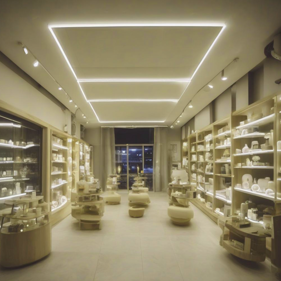 Modern detailed nightlights shop with minimalistic design and warm lighting from afar.