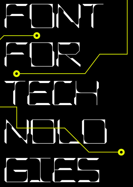 Акцидентный шрифт, вдохновленный IT-технологиями. Сформирован на основе детального изучения образа микросхем, модульных квадратов, вызывающих идею электрических цепей, цифровых фрагментов и соединений.
