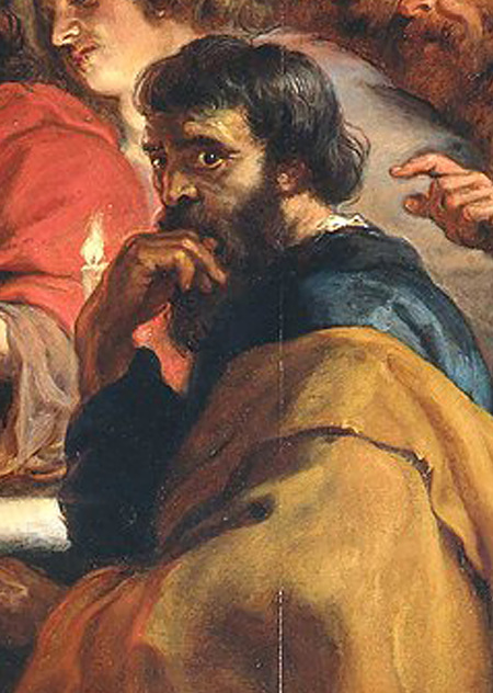 Так, например, у него, в отличие от остальных апостолов, нет нимба. Сам он повёрнут к зрителю спиной, и, стоит отметить, сильнее своих товарищей — смотрящему почти не видно его глаз. Кроме того, сидит он вполне обособлено: не участвует в разговоре апостолов справа, но смотрит на Христа.