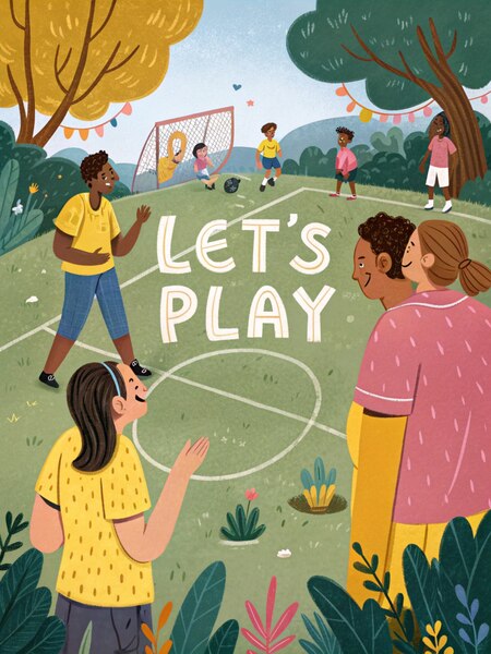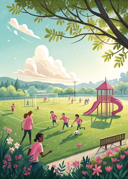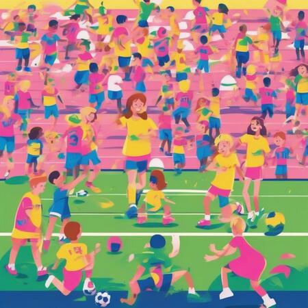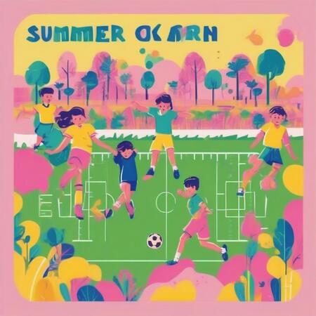 Prompt: a blue poster with a football field and boys and girls playing in pink yellow and green T-shirts. the poster shows the season — summer. the poster is vector and the color palette is bright and juicy
