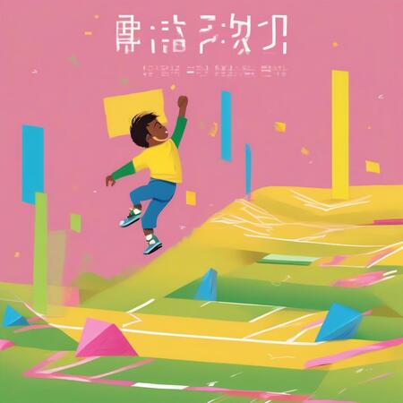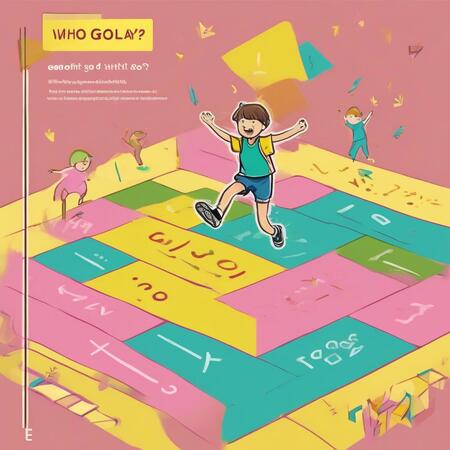Prompt: generate a vector yellow poster with pink, green, blue sticks folded into hopscotch and a boy jumping, at the bottom of the poster is written: «Who is golya???»