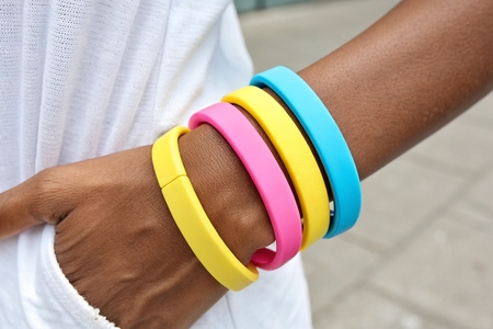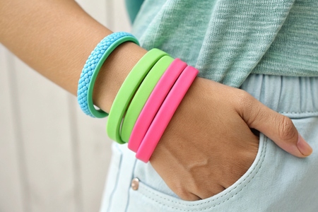 Prompt: rubber bracelets of green, pink and blue colors on a person’s hand