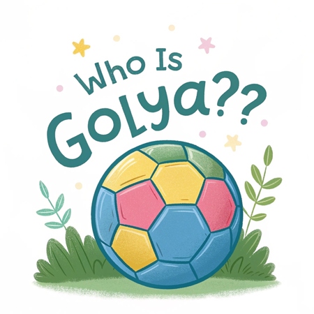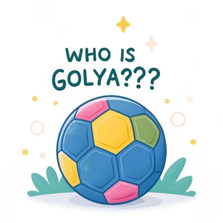 Prompt: logo for the festival of children’s yard games. In the middle of the logo is a blue soccer ball with yellow, pink, and green hexagons. Above is the inscription: «Who is golya???»