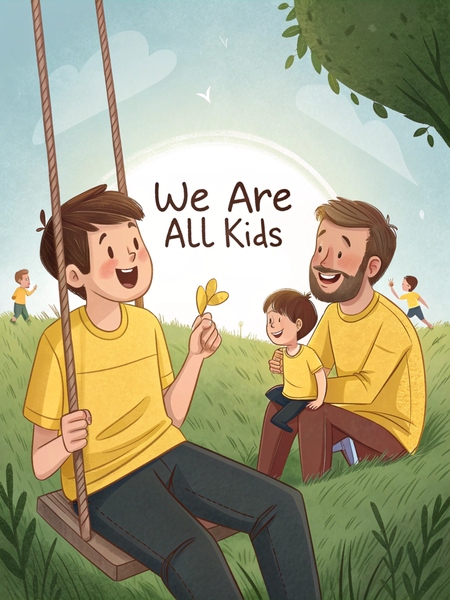 Prompt 1: poster against the background of a children’s yard: adults are divided into two teams: one in yellow clothes and the other in pink clothes. They look at each other and smile. in the middle stands a judge in a blue T-shirt. it’s summer outside and there is a group of spectators around. Prompt 2: A little boy and an adult man are sitting on a swing. They are both wearing colorful T-shirts of blue, pink and green. They are looking forward and laughing, nearby adults and children are playing hide and seek
